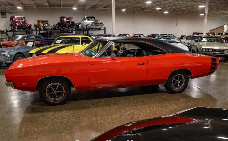 1969 Dodge Charger R/T SE, numbers-matching and fully restored. Finished in Charger Red with black vinyl top. Powered by a correct 440 Magnum 4-barrel V8. Original body panels and detailed interior with wood trim and power windows. A rare survivor featured in Hemmings Muscle Machines.