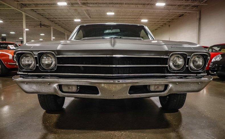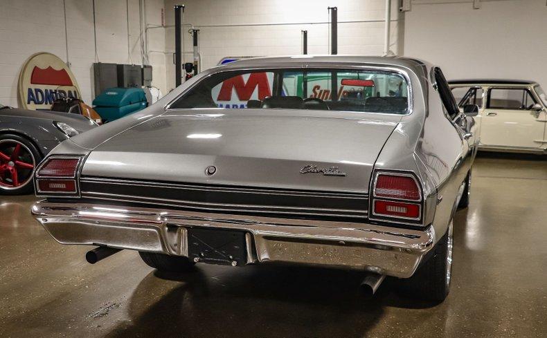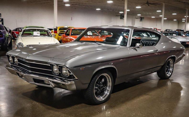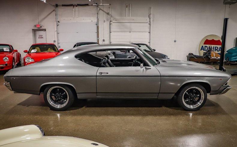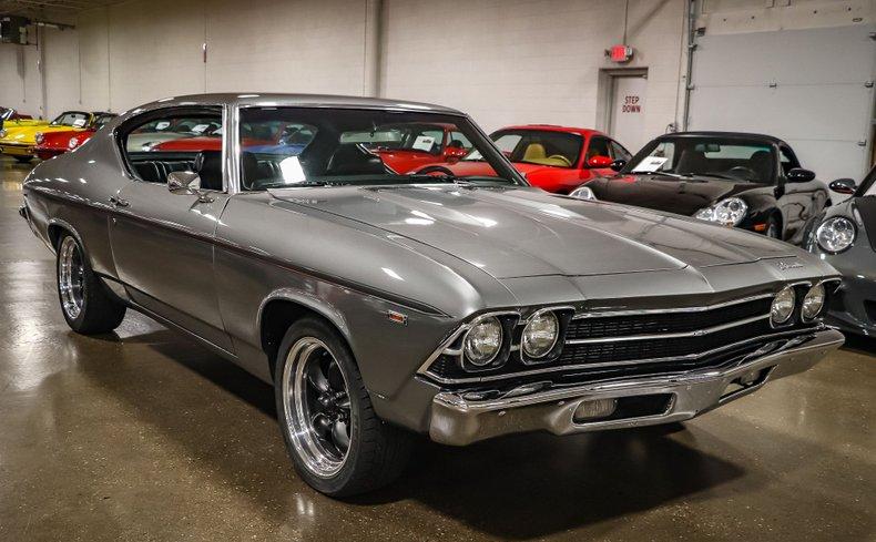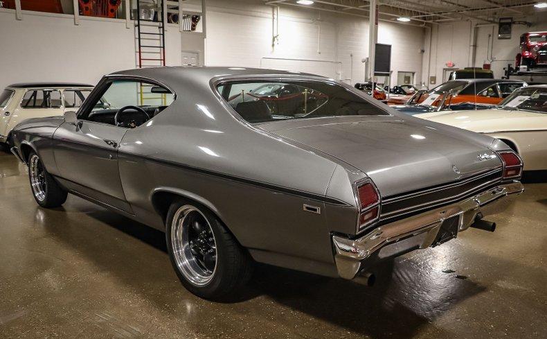 1969 Chevrolet Chevelle Malibu 2-door coupe in metallic gray with black stripe and black vinyl interior. Powered by a 350ci V8 with TH350 automatic, featuring Edelbrock air cleaner and valve covers, plus a Pypes Street Pro exhaust with X-pipe. Upgraded suspension, front disc brakes, and aftermarket 5-spoke wheels. Clean, tough-looking muscle car with black Momo steering wheel and auxiliary gauges.