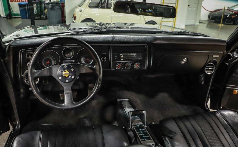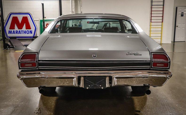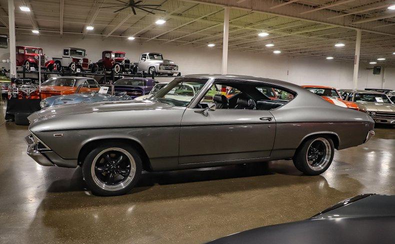 1969 Chevrolet Chevelle Malibu 2-door coupe in metallic gray with black stripe and black vinyl interior. Powered by a 350ci V8 with TH350 automatic, featuring Edelbrock air cleaner and valve covers, plus a Pypes Street Pro exhaust with X-pipe. Upgraded suspension, front disc brakes, and aftermarket 5-spoke wheels. Clean, tough-looking muscle car with black Momo steering wheel and auxiliary gauges.